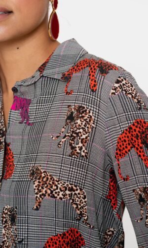 Breng kleur en karakter in je garderobe met deze Geisha blouse in een opvallende checkered print met luipaarddetails. De combinatie van roze en oranje tinten geeft de blouse een speelse en moderne uitstraling.