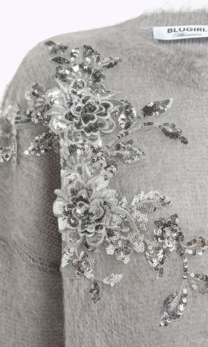 Voeg een vleugje luxe en elegantie toe aan je garderobe met deze mohair blend trui van Blu Girl. Het ontwerp wordt verrijkt met een driedimensionale bloemenapplicatie, verfijnd borduursel en subtiele pailletten die zorgen voor een sprankelend effect.