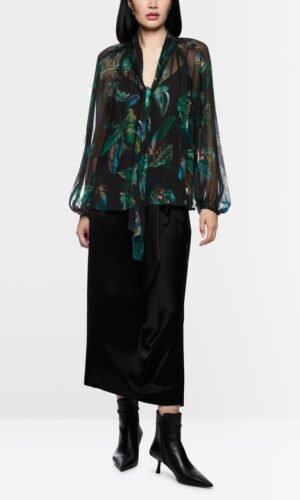 Deze MarcCain blouse in de kleur Dark Jade Green straalt verfijning en elegantie uit. Het lichte, transparante viscose is bedrukt met een subtiele veerprint en geeft de blouse een luchtige uitstraling.