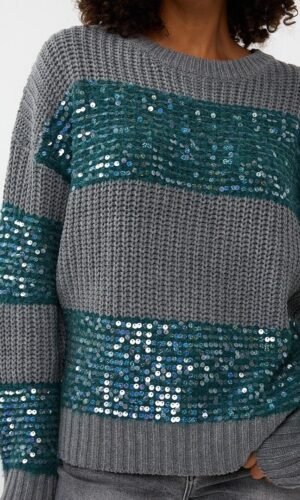 De Esqualo Oversized Stripes trui in de kleur Teal is een stijlvolle en comfortabele must-have voor het najaar. De trui heeft een modern, oversized silhouet met speelse horizontale strepen en subtiele pailletten die zorgen voor een vleugje glamour.