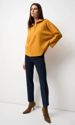 Deze Joseph Ribkoff trui, gemaakt van een zachte brushed viscosemix, combineert comfort met moderne elegantie. Het jacquard-patroon in vierkante steken geeft structuur en karakter, terwijl de opstaande kraag en driekwart dolmanmouwen een ontspannen, stijlvolle pasvorm creƫren.