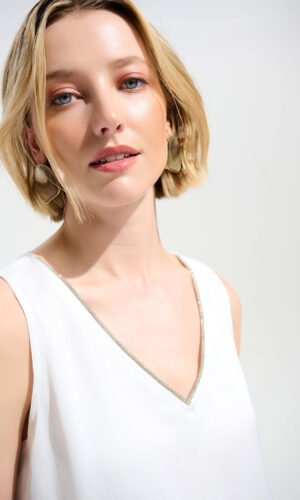 Verfijnd en elegant, deze Joseph Ribkoff top is vervaardigd van gerecycled gehammerd satijn en straalt tijdloze klasse uit. De strakke, mouwloze snit en V-hals worden subtiel verfraaid met een fijne rand van strass-steentjes, wat een sprankelend accent toevoegt.