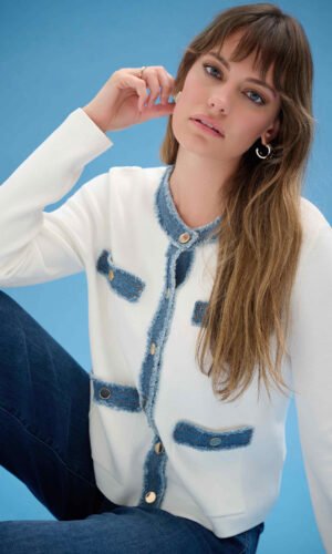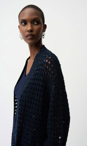 Deze stijlvolle cardigan van Joseph Ribkoff is vervaardigd uit een comfortabele katoenmix met subtiele pailletgaren voor een verfijnde, moderne uitstraling. Het opengewerkte breisel en de boxy pasvorm geven het vest een luchtige, casual look, terwijl de driekwartmouwen zorgen voor een eigentijdse touch