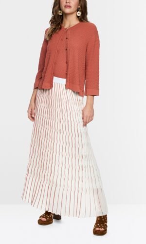 Deze MarcCain maxirok combineert elegantie met comfort. Gemaakt van soepelvallende, lichte kunstvezel, valt de rok prachtig en geeft een zwierige, vrouwelijke uitstraling bij elke beweging. Het opvallende detail zijn de fijne plissƩs met contrasterende randen, die speelsheid en een verfijnde touch toevoegen.