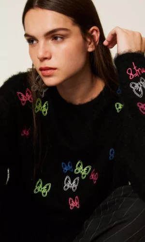 Deze unieke trui uit de Actitude-collectie van Twinset, ontworpen door kunstenaar Myfo, is een echte eyecatcher. Het model is gemaakt van een mix van wol en mohair, wat zorgt voor een warme en zachte draagervaring.