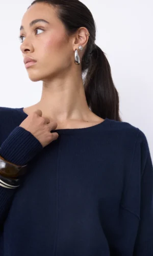 De Nenette trui in donkerblauw is een elegante basic met een aansluitende pasvorm die de vrouwelijke lijnen subtiel accentueert. Uitgevoerd met een ronde hals en lange mouwen met ribstructuur in hoog-laag effect, wat zorgt voor een verfijnde en moderne uitstraling.