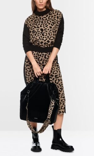 Deze stijlvolle trui van MarcCain combineert een moderne uitstraling met ultiem comfort. Het hooggesloten model heeft vleermuismouwen en een opvallend luipaardpatroon op het voorpand, waardoor het een echte eyecatcher is.