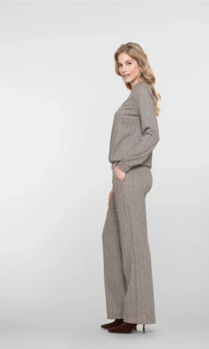 Deze Geisha flared broek in bruin/goud is een echte eyecatcher. Het zigzagpatroon met lurex geeft de broek een stijlvolle glans en een feestelijke uitstraling. Met een high-rise taille en een elastische tailleband zit hij comfortabel en elegant, terwijl de flared pijpen zorgen voor een vrouwelijk, trendy silhouet.