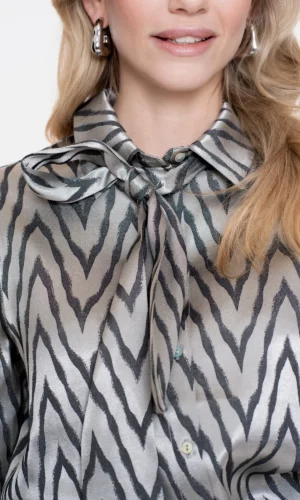 Deze Geisha blouse in zilvergrijs straalt elegantie uit dankzij de subtiele zigzagprint met glans. Het model heeft een aangesloten pasvorm en een klassieke kraag met strikdetail, wat zorgt voor een vrouwelijke en verfijnde uitstraling.