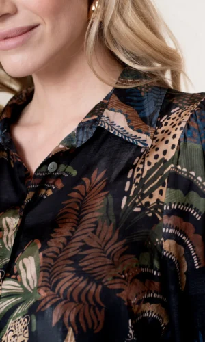 Voeg een vleugje luxe en speelsheid toe aan je garderobe met deze Geisha satin blouse in een stijlvolle animal print. De combinatie van zwart, zand, groen en blauw zorgt voor een opvallend maar elegant kleurenspel.