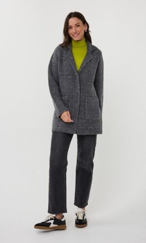 Ga voor een stijlvolle Ʃn comfortabele look met dit veelzijdige Esqualo vest blazer. Uitgevoerd in een donkergrijs melange kleur en verfijnd met subtiel ingeweven pailletten, die op elegante wijze het licht vangen en een vleugje glamour toevoegen aan je outfit.