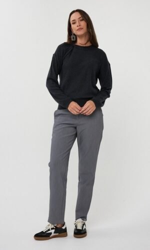 De Geisha flared classic broek in grijs/zwart is een comfortabele en stijlvolle basic met een moderne twist. Het model heeft een high-rise taille met een elastische tailleband en aantrekkoord, wat zorgt voor een perfecte en flexibele pasvorm.
