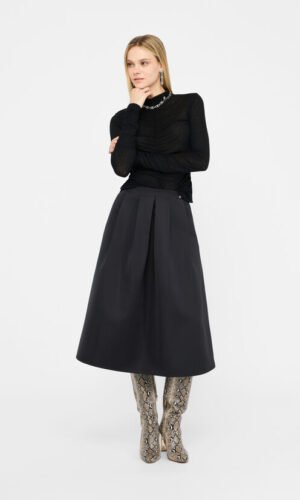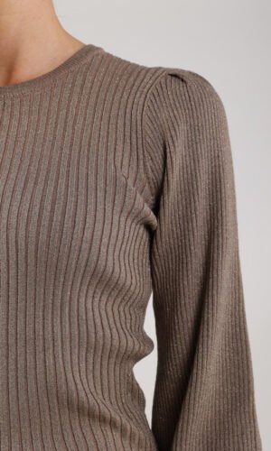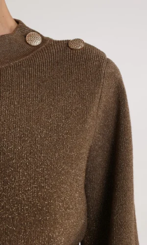 De Nukus Daytona trui in de kleur Fango is een stijlvolle knit met een moderne, vrouwelijke uitstraling. Dankzij de subtiele glans van de lurex stof, de sierlijke knoopjes op de schouder en de pofmouwen krijgt deze pullover een elegant karakter