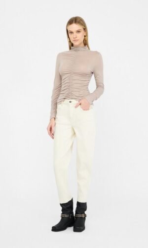 De Nukus Mulberry trui in de kleur Fango is een verfijnde knit met een subtiele vrouwelijke touch. Gemaakt van een zachte viscosemix met lurex, combineert deze pullover comfort en een vleugje glans.