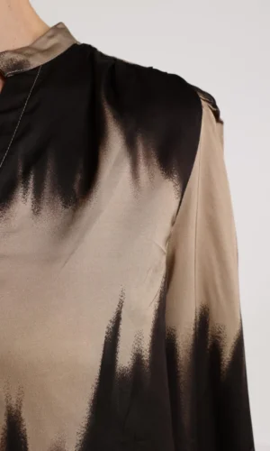 De Nukus Lizzy blouse in sand/dark chocolate is een echte musthave voor wie houdt van stijl met een moderne twist. De blouse is uitgevoerd in een vrouwelijke all-over print en heeft een klassieke knoopsluiting, waardoor hij zowel elegant als veelzijdig te dragen is.
