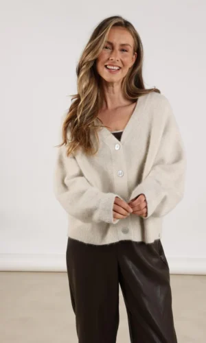 De Nukus Magda cardigan in Off White is een elegante essential die niet mag ontbreken in je garderobe. Dankzij de zachte wolmix biedt dit vest warmte en comfort, terwijl de klassieke knoopsluiting zorgt voor een tijdloze uitstraling.