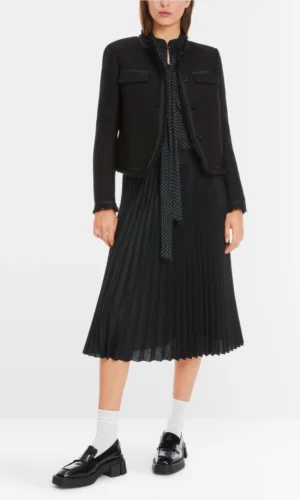 Deze elegante korte kraagloze jas van MarcCain (XC 31.17 W55) is vervaardigd uit een gestructureerde stof met stijlvolle, gerafelde randen. De jas heeft een subtiel getailleerde vorm, waarbij prinsessennaden aan de achterkant en coupe naden aan de voorkant zorgen voor een nauwsluitende en flatterende pasvorm.