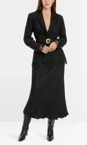 De Marc Cain Blazer van guipure kant XG3404W12 straalt verfijnde, vrouwelijke elegantie uit en is een stijlvolle toevoeging aan elke garderobe. Deze nauwsluitende blazer is gemaakt van hoogwaardige guipure kant en heeft een prachtig, gedetailleerd ontwerp.