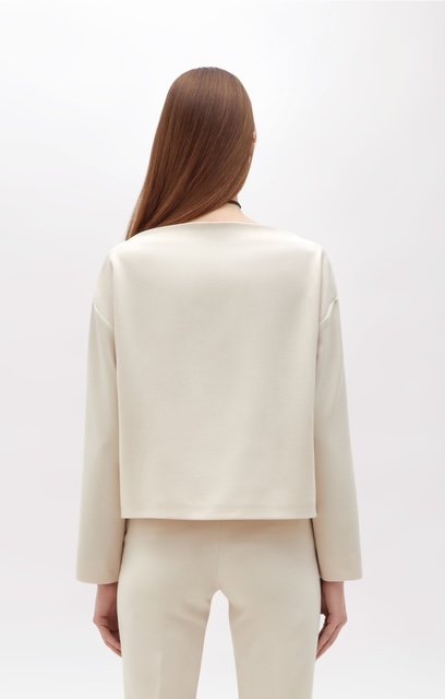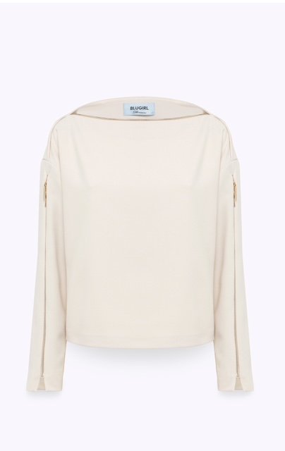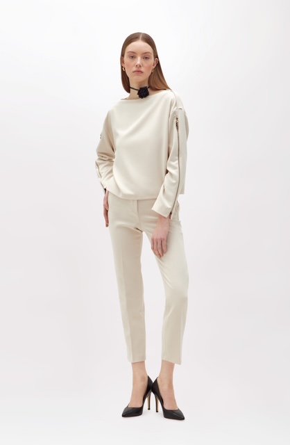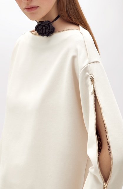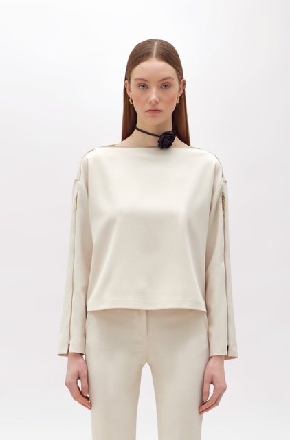 Het ontwerp heeft een rechte, boxy pasvorm met een bootshals en verlaagde schoudernaden voor een eigentijdse look. Een opvallend detail is de rits aan de mouwen, die volledig kan worden geopend voor een cape-effect ā een subtiele maar elegante knipoog naar high fashion. De voering met dierenprint die door de open mouwen zichtbaar wordt, geeft de blouse extra karakter en stijl.