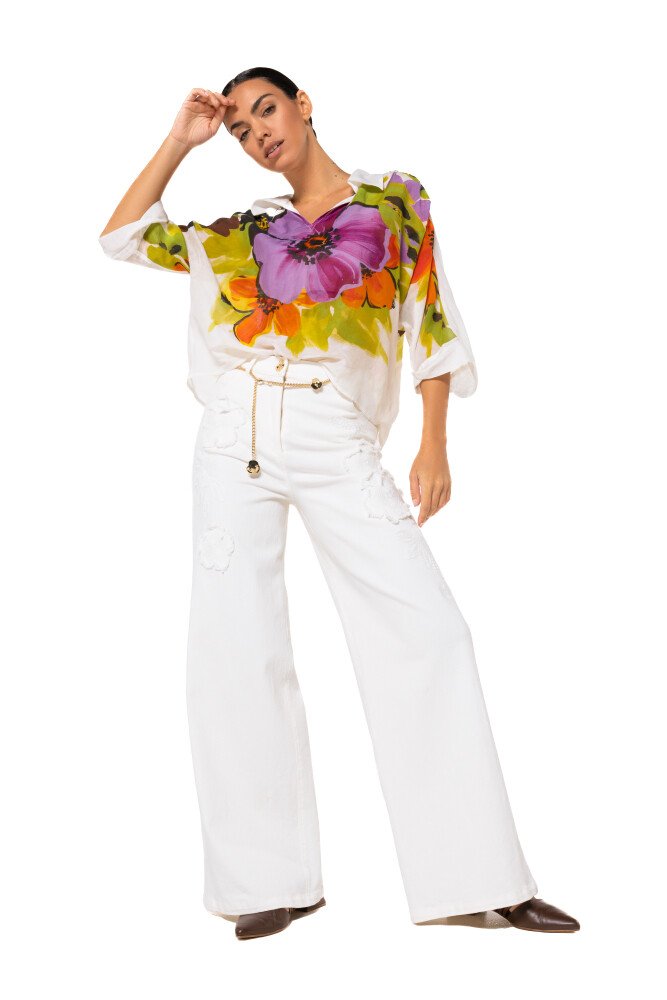 Deze stijlvolle jeans van Caroline Biss combineert een tijdloze pasvorm met een speels en vrouwelijk accent. Het mid-waist model sluit mooi aan in de taille en biedt een comfortabele fit dankzij de toevoeging van elastaan. Het opvallende, uitgerafelde bloemdetail geeft de jeans een unieke en modieuze uitstraling.