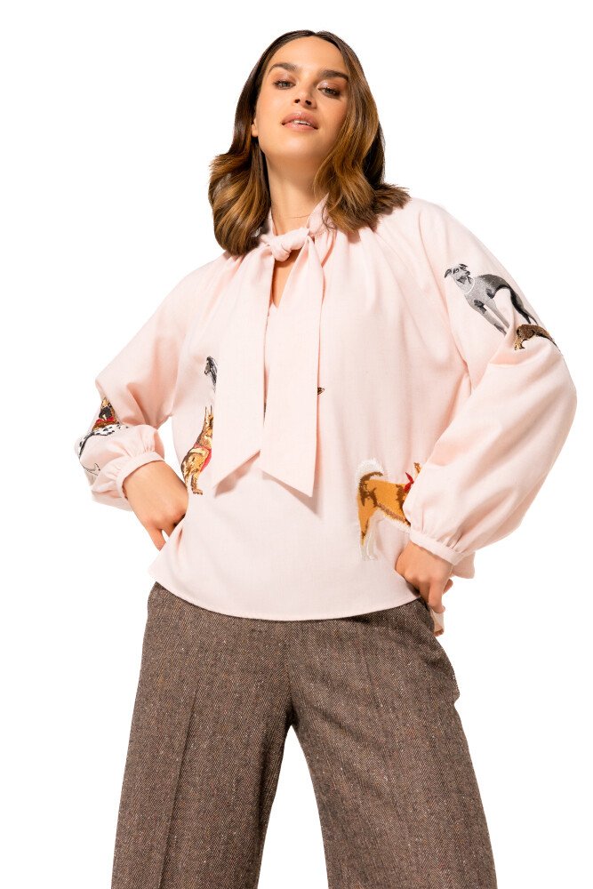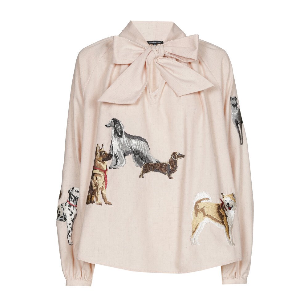 Deze rechtvallende blouse van Caroline Biss is een elegante toevoeging aan je garderobe, verrijkt met een speels en verfijnd hond broderie detail. De blouse heeft een vrouwelijke V-hals met een vaste strik, die zorgt voor een stijlvolle en tijdloze uitstraling.