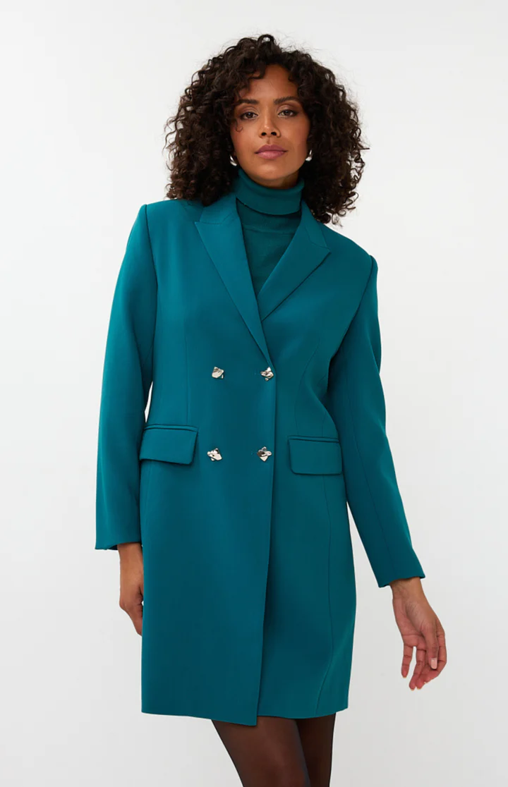 De Esqualo Jurk Blazer City Teal is een stijlvolle en elegante blazerjurk die kracht en verfijning uitstraalt. Dankzij de dubbele rij knopen en de getailleerde pasvorm krijgt de jurk een chique en moderne uitstraling, ideaal voor zowel zakelijke afspraken als feestelijke gelegenheden.