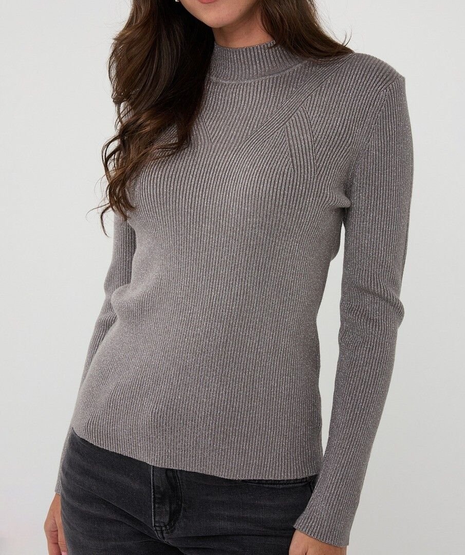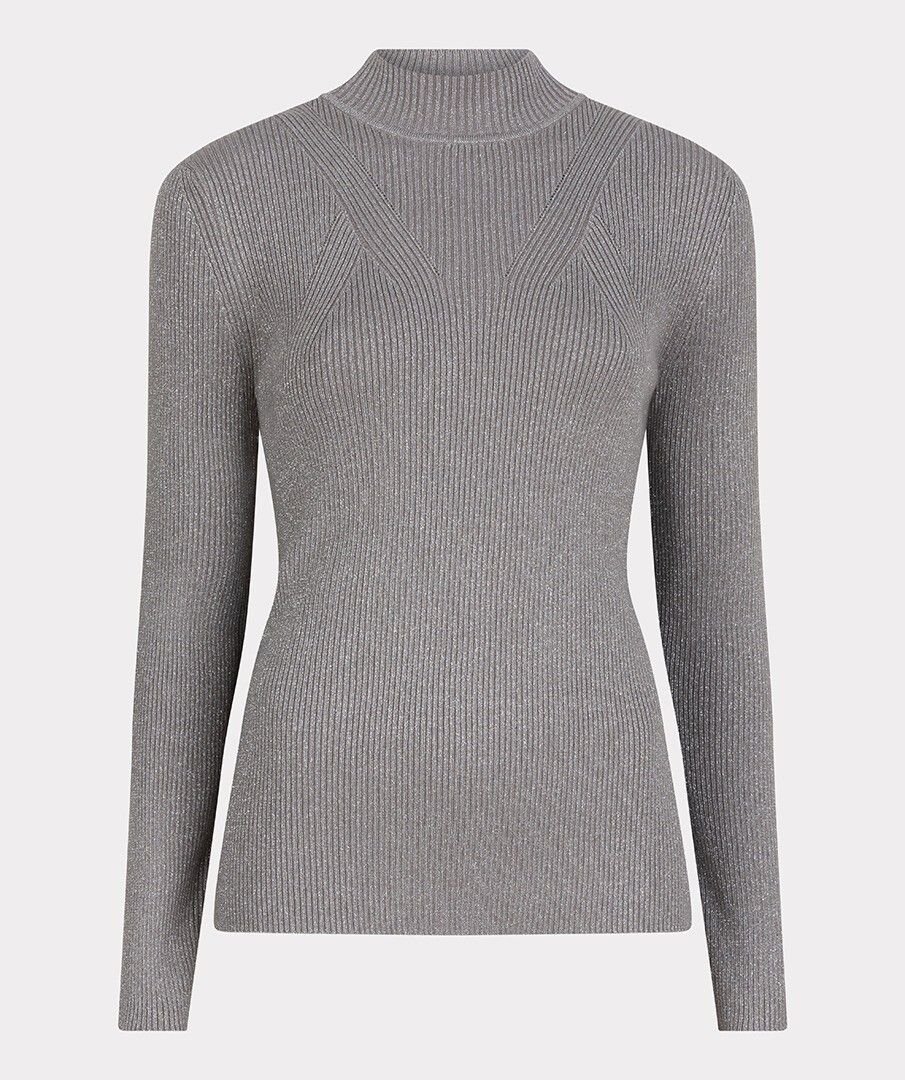 Voeg een subtiel glanzend accent toe aan je garderobe met deze Esqualo fijngebreide coltrui in grijs. Het ribpatroon is doorweven met lurex, waardoor de top een elegante sparkle krijgt en perfect geschikt is voor zowel casual als feestelijke looks.