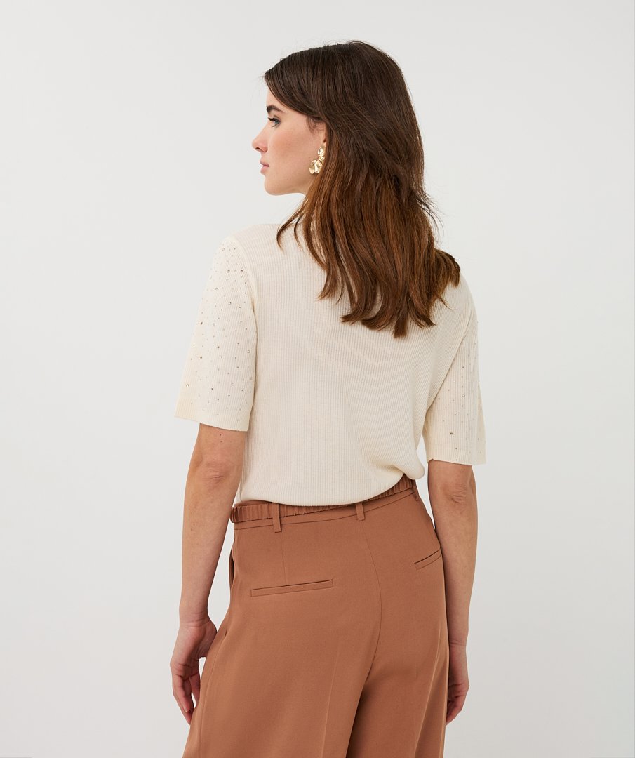 De Esqualo Top Rib Sequins in Ecru is een elegante en feestelijke top met halve mouwen en een subtiel ribdetail. De voorzijde is verfraaid met kleine strass steentjes, waardoor de top een sprankelend accent krijgt en perfect is voor speciale gelegenheden of een chique avondlook.