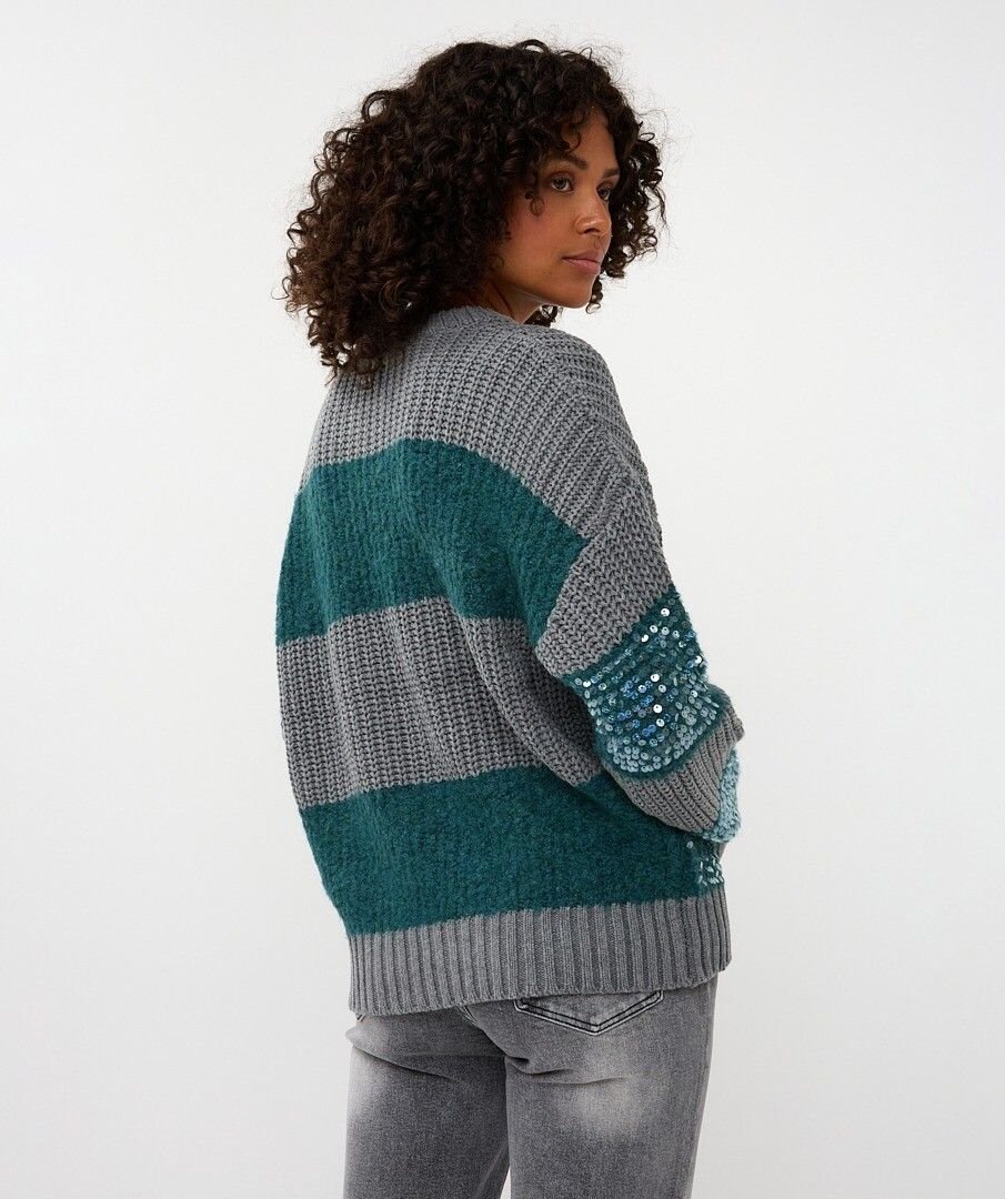 De Esqualo Oversized Stripes trui in de kleur Teal is een stijlvolle en comfortabele must-have voor het najaar. De trui heeft een modern, oversized silhouet met speelse horizontale strepen en subtiele pailletten die zorgen voor een vleugje glamour.