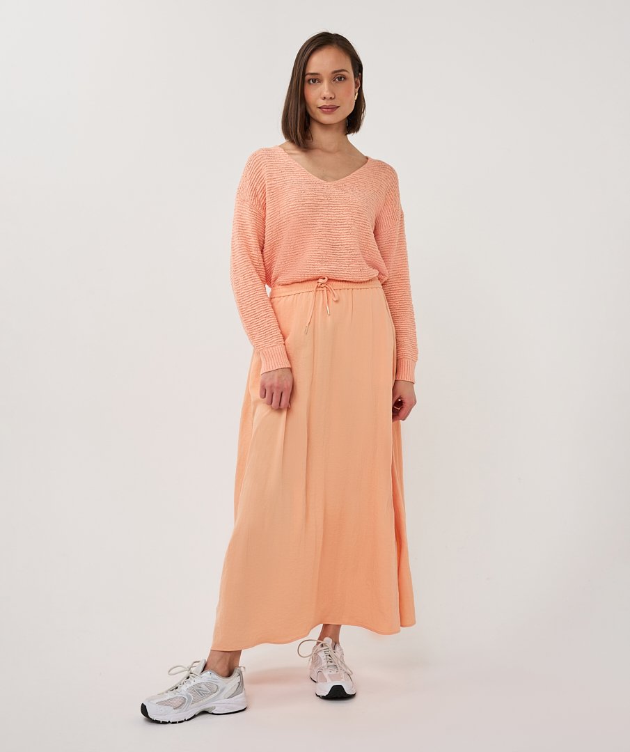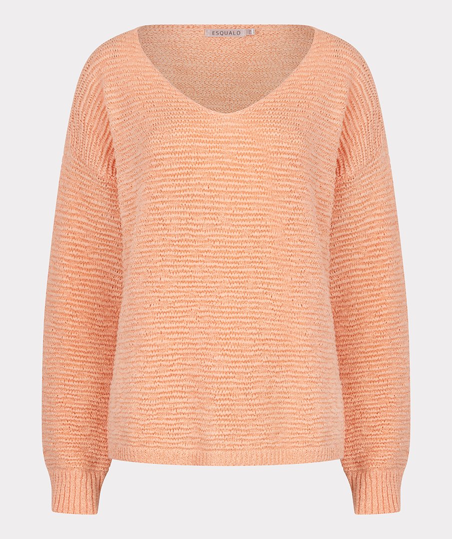 De Esqualo Trui V-Neck Tape Yarn in Bellini is een comfortabele en stijlvolle wijdvallende trui met een v-hals en lange mouwen. Het lichte en zachte materiaal van 60% polyester en 40% katoen zorgt voor een soepele pasvorm en prettig draagcomfort, ideaal voor dagelijks gebruik