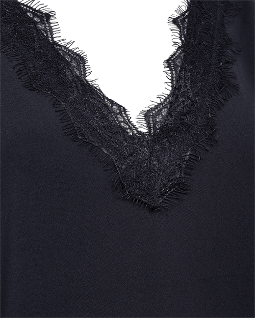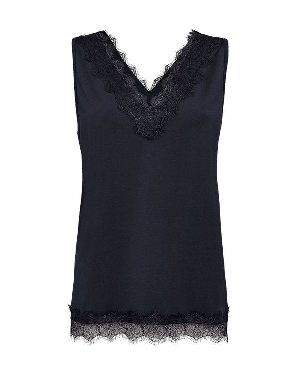 De FQBICCO top van Freequent in de elegante kleur Salute is een vrouwelijke basic met verfijnde details. Deze mouwloze top is gemaakt van een soepele stof met lichte stretch en is langs de V-halslijn en zoom afgewerkt met kant. Het ontwerp combineert comfort met een romantische uitstraling.