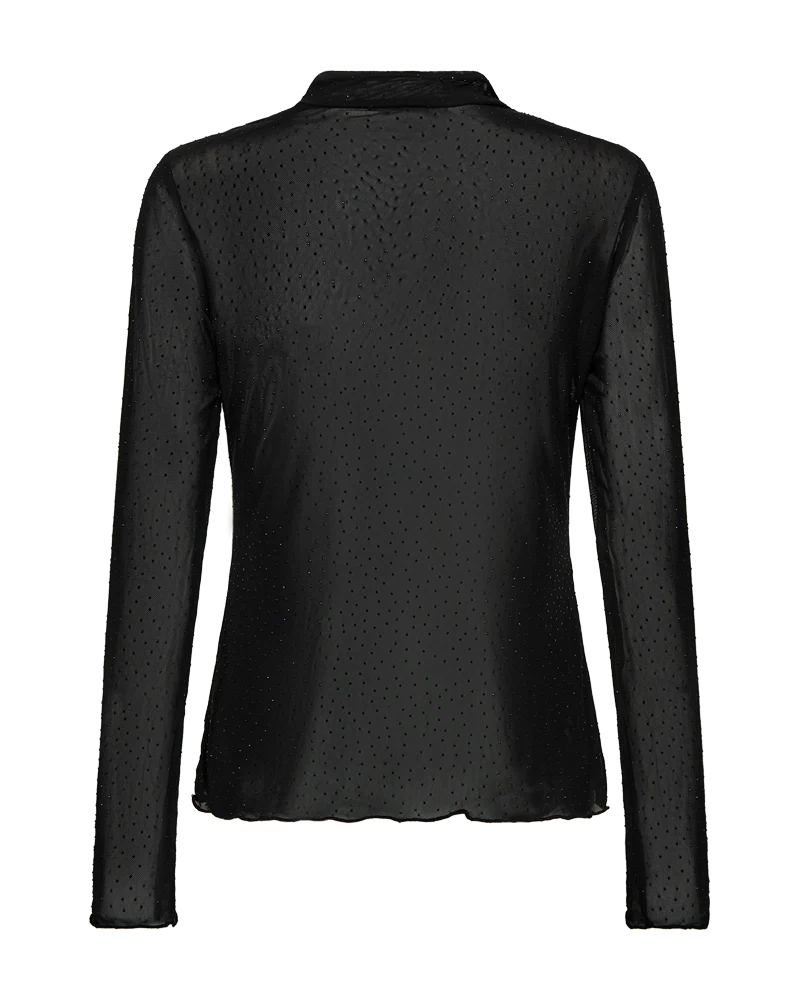 Deze stijlvolle Freequent FQISKA top in het zwart is een elegante toevoeging aan je garderobe. Gemaakt van transparant mesh met subtiele strass-steentjes, geeft deze top een sprankelende touch aan iedere outfit. Het nauwsluitende model en de hoge hals zorgen voor een verfijnde, vrouwelijke uitstraling.