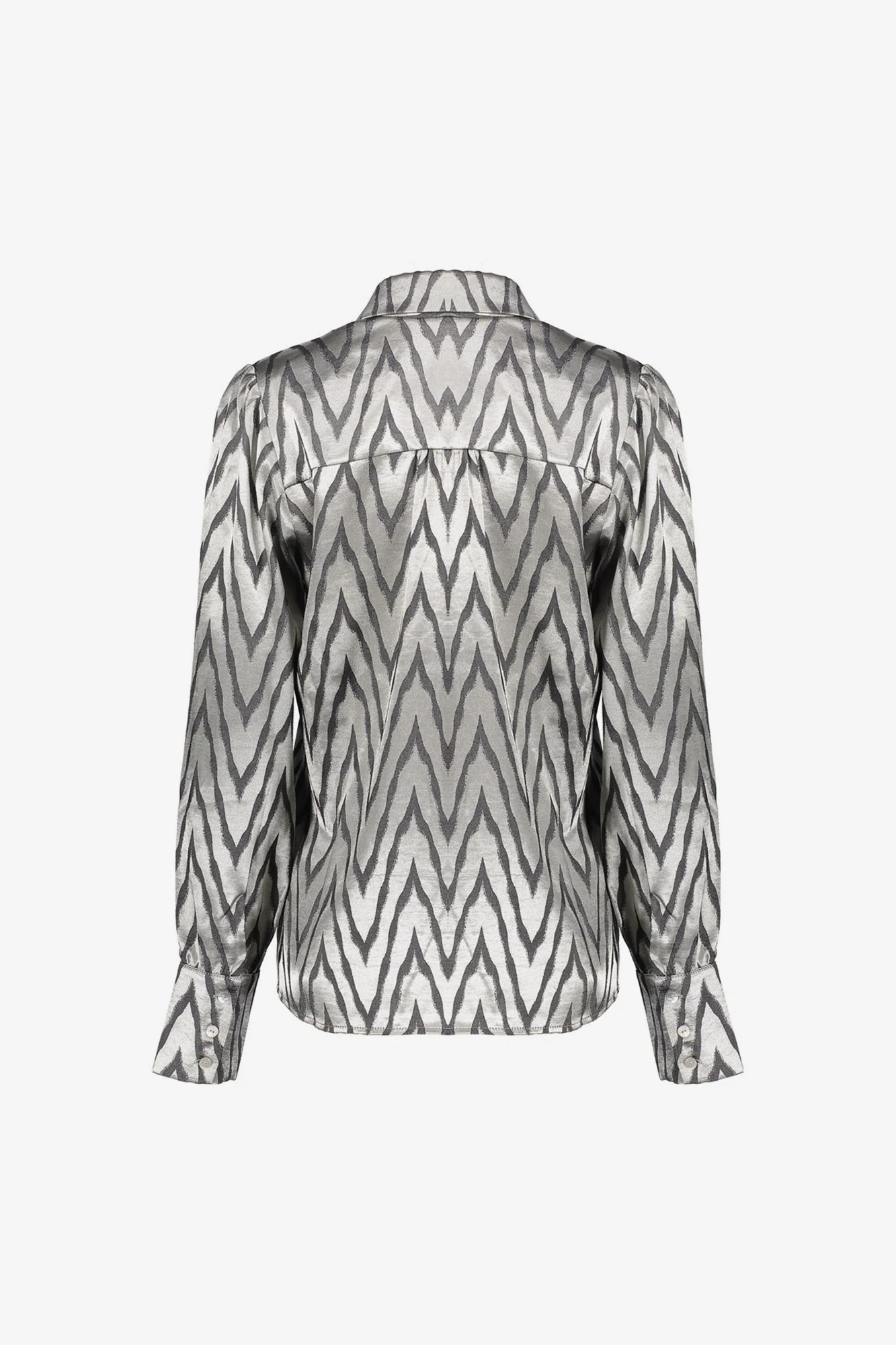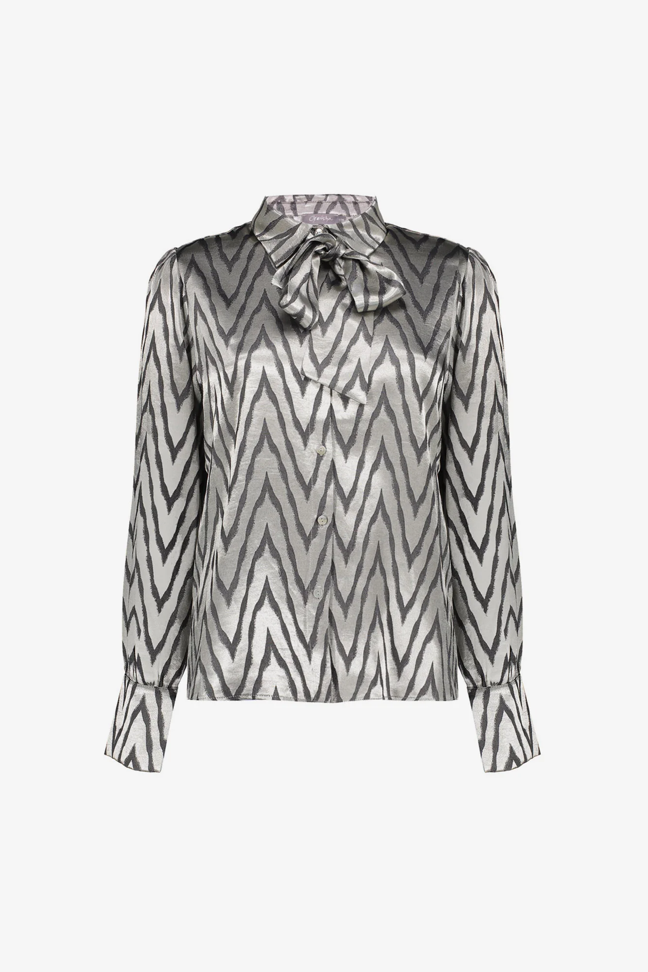 Deze Geisha blouse in zilvergrijs straalt elegantie uit dankzij de subtiele zigzagprint met glans. Het model heeft een aangesloten pasvorm en een klassieke kraag met strikdetail, wat zorgt voor een vrouwelijke en verfijnde uitstraling.