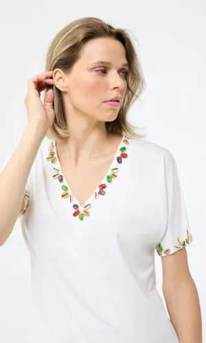 Met een klassieke ronde hals en korte mouwen, heeft het Mathilda T-shirt een comfortabele en tijdloze pasvorm. De kleine grijze strikjes, subtiel geplaatst rond de halslijn, geven het een chique en originele uitstraling die het ontwerp net dat beetje extra geeft.