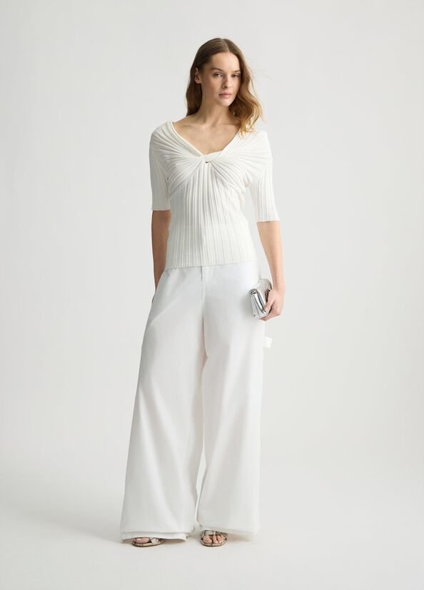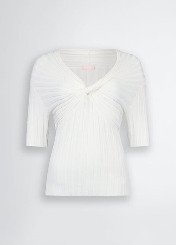 Deze Liu Jo knit top in off-white straalt elegantie en vrouwelijkheid uit. Gemaakt van een zachte viscose mix, heeft deze rib gebreide top een stijlvolle off-the-shoulder halslijn met een verfijnde knoop aan de voorkant