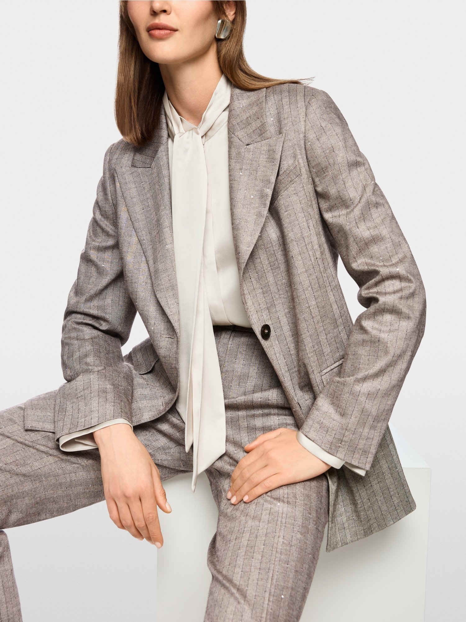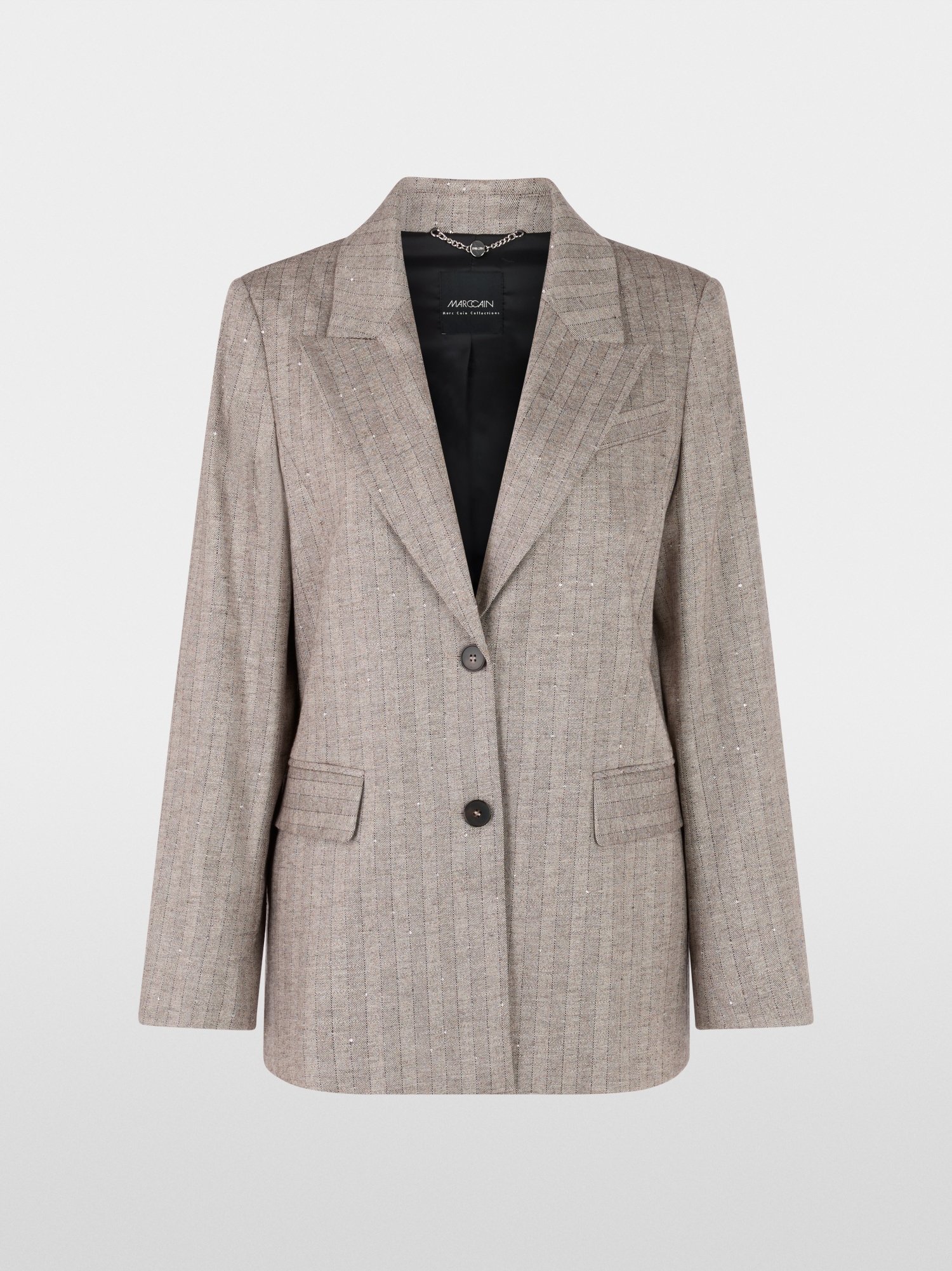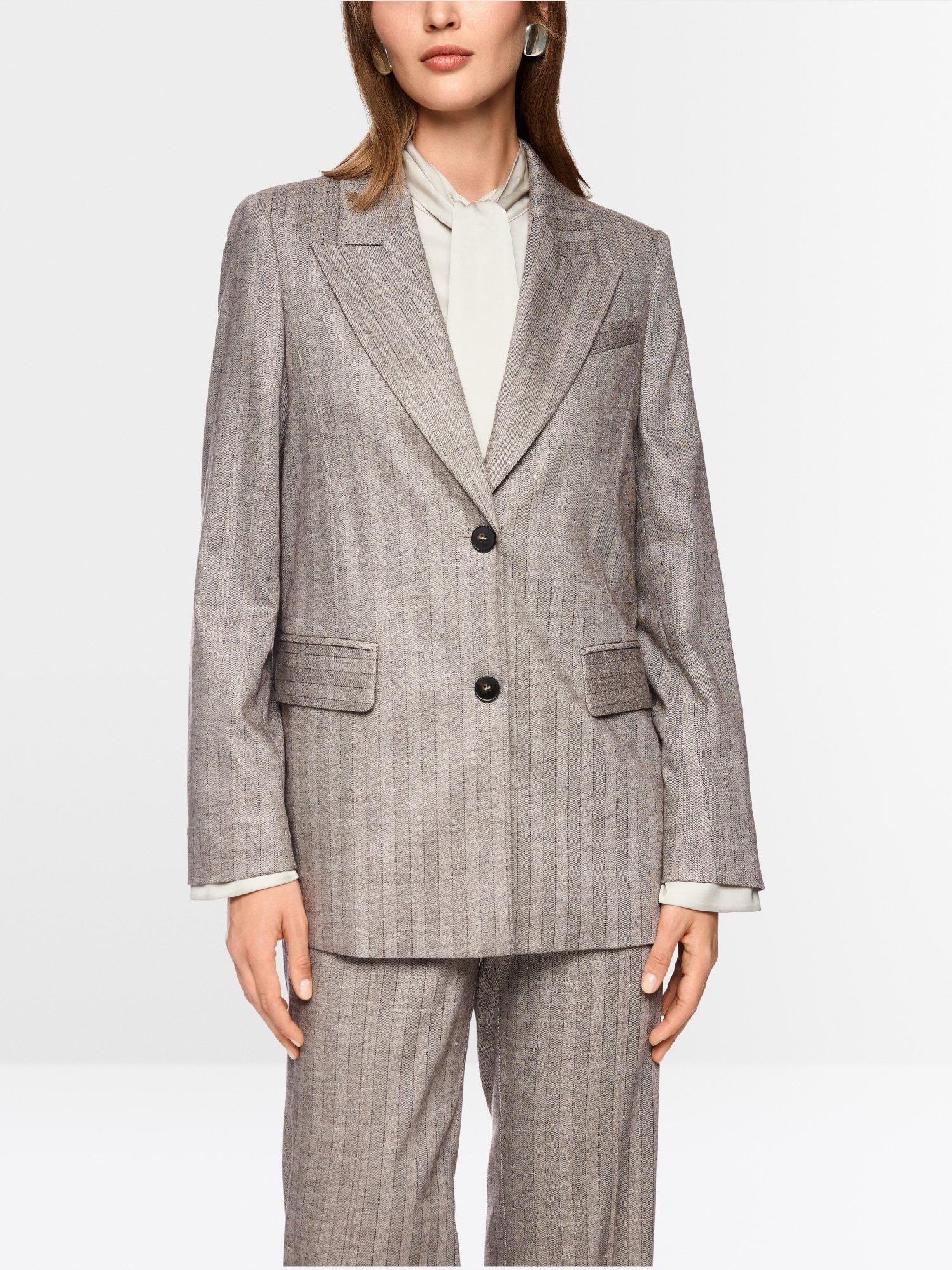 Deze elegante blazer van Marc Cain combineert moderne stijl met tijdloze klasse. Het hoogwaardige viscosemix voelt comfortabel aan en valt prachtig dankzij het losse, lange silhouet. Het subtiele streep motief met minipailletten geeft een verfijnde glans, terwijl de gewatteerde schouders zorgen voor een krachtige, gedefinieerde look.