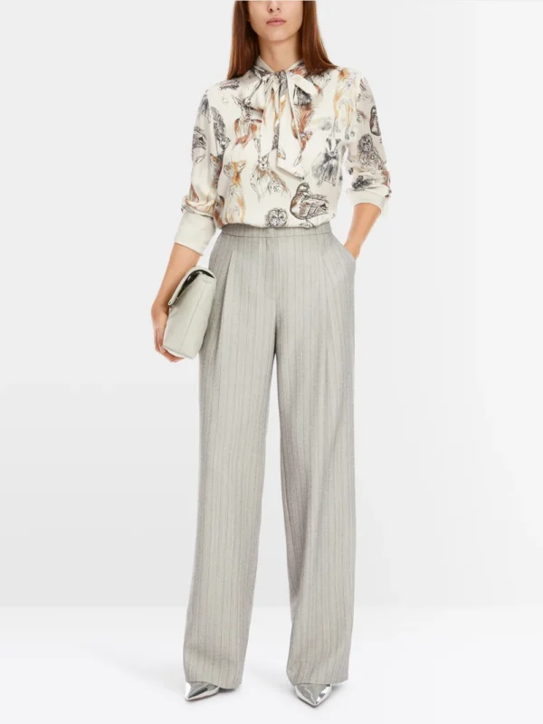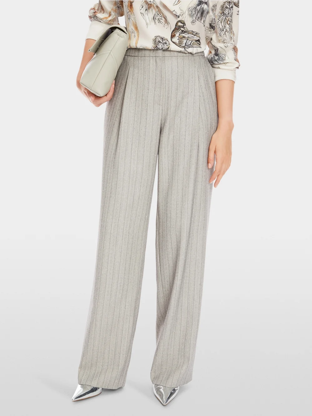 Maak een stijlvol statement met de MarcCain WASCO Marlene broek, uitgevoerd in de verfijnde kleur Smoke. Deze geplooide broek combineert klassieke elementen met een moderne twist. De stof, een combinatie van visgraat en krijtstreep, is subtiel versierd met glinsterende glitter steentjes, wat zorgt voor een sprankelende look.