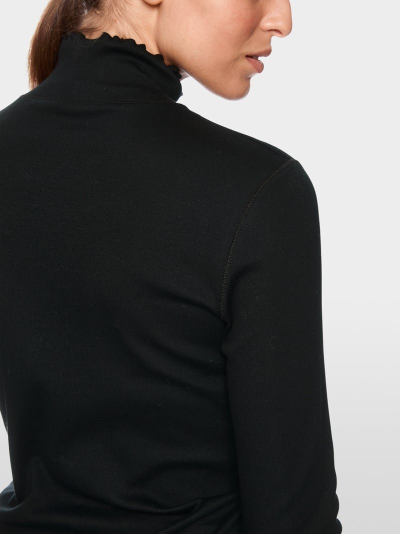 Een tijdloos basic item met subtiele elegantie: dit smal gesneden shirt van MarcCain is uitgevoerd in een fijne ribkwaliteit en voorzien van een stijlvolle rolkraag. De rolzomen aan mouwen en hals geven het ontwerp een verfijnde, moderne touch.