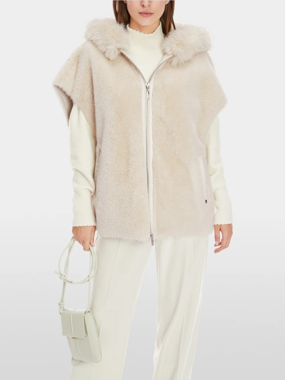 Voeg een vleugje luxe en comfort toe aan je garderobe met dit oversized vest van MarcCain in de kleur Smoke. Dit model is perfect voor coole layering, dankzij de oversized snit en rechte vorm met grote armsgaten. Het vest heeft een opvallende capuchon, afgezet met langharig leuk bont, wat zorgt voor een modieuze en warme uitstraling.