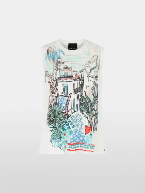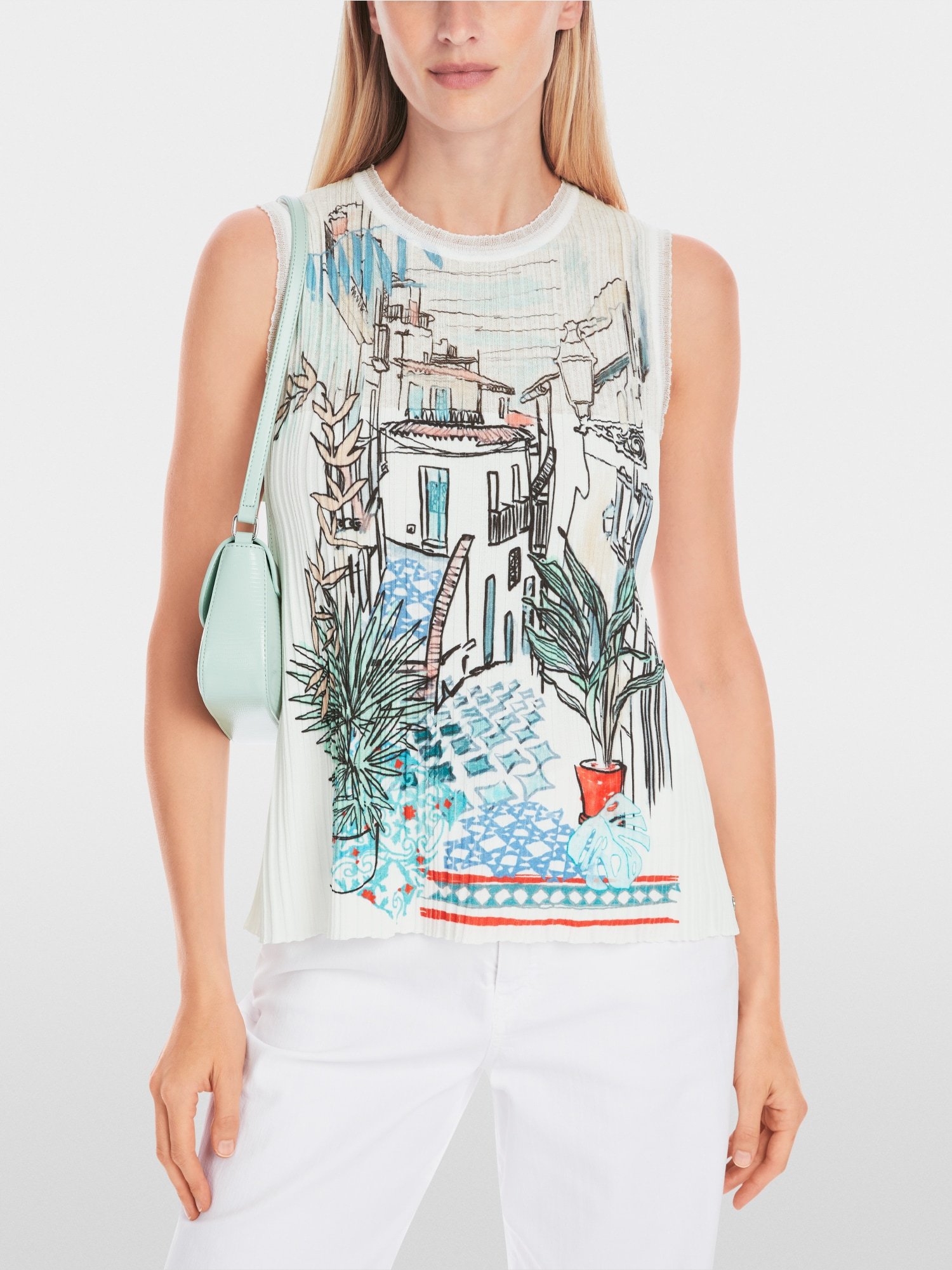 Deze mouwloze top (model YC6118M38) in de kleur Off White (110) combineert een vrouwelijke A-lijn pasvorm met een unieke vintage uitstraling. Gemaakt van een zachte, vloeiende vezel mix, biedt het plissé-breisel een verfijnde structuur. De voorzijde is bedrukt met een retro-ansichtkaartmotief uit de jaren ‘50, wat deze top een speelse en stijlvolle look geeft.