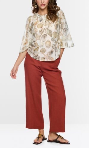 De fijne tricot met subtiel structuurpatroon en elegante bouclƩ geeft het ontwerp een bijzondere textuur. De schelpenprint in getekende stijl zorgt voor een speels en artistiek accent, perfect voor een frisse zomerse look.