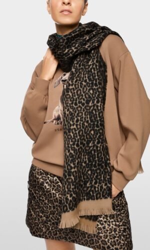 Deze stijlvolle trui van MarcCain combineert een moderne uitstraling met ultiem comfort. Het hooggesloten model heeft vleermuismouwen en een opvallend luipaardpatroon op het voorpand, waardoor het een echte eyecatcher is.