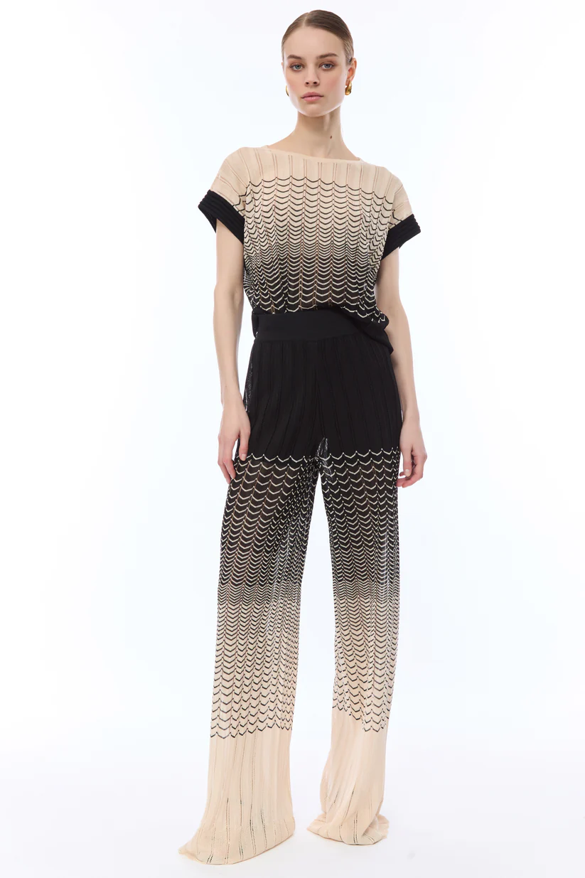 Het ontwerp wordt gekenmerkt door een stijlvolle boothals en korte kimonomouwen, wat zorgt voor een moderne en ontspannen look. De verfijnde, golvende perforatie met subtiel kleurverloop geeft de trui een dynamisch spel van texturen en maakt het geheel extra bijzonder.