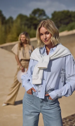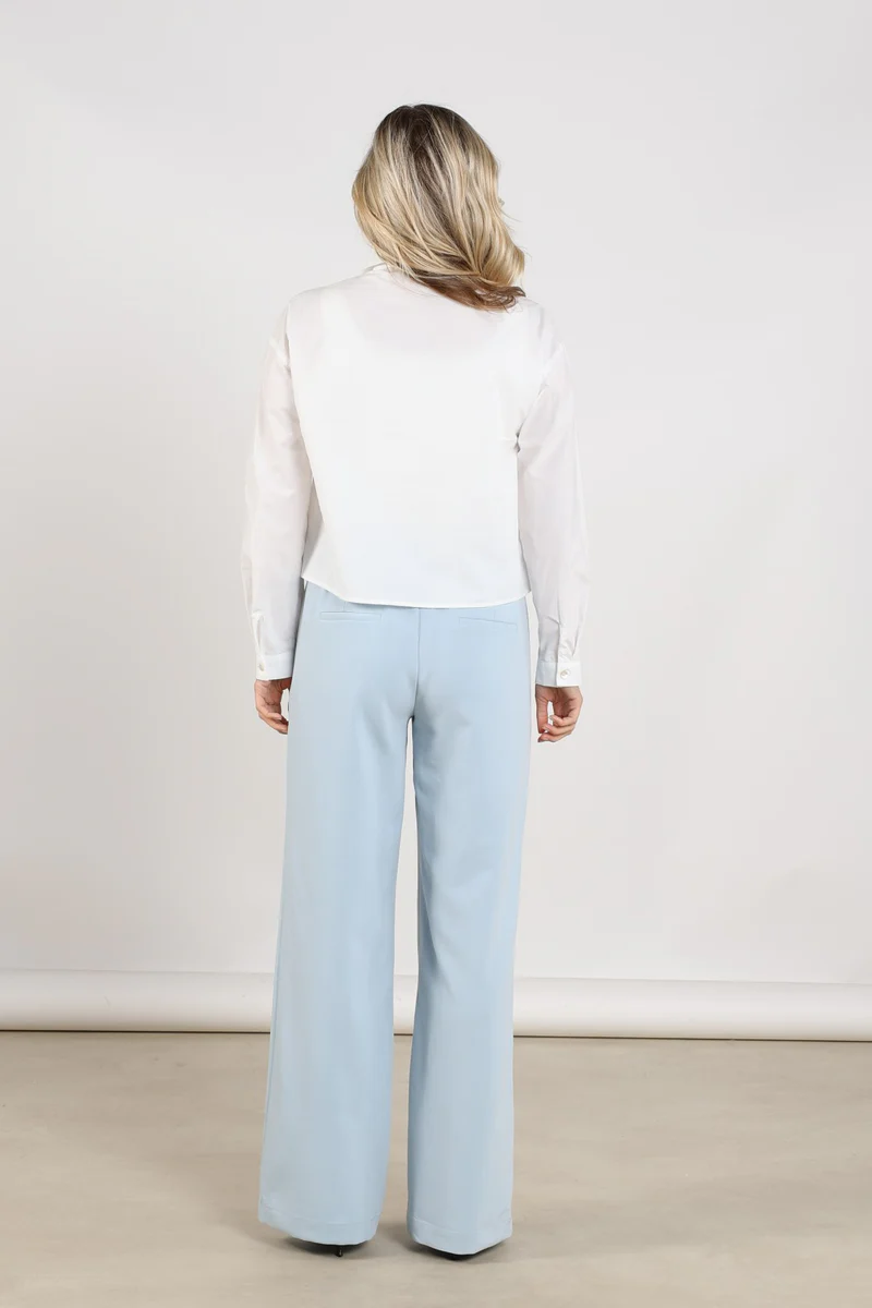 De blouse heeft een op maat gemaakte pasvorm die het silhouet mooi volgt en tegelijkertijd comfortabel draagt. De subtiele pareldetails geven het ontwerp een luxe en vrouwelijke touch, waardoor de blouse een echte eyecatcher wordt.