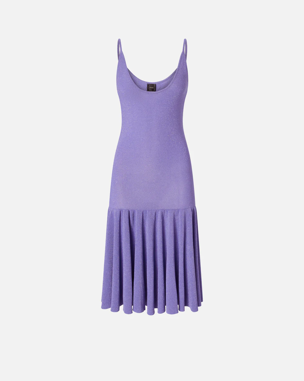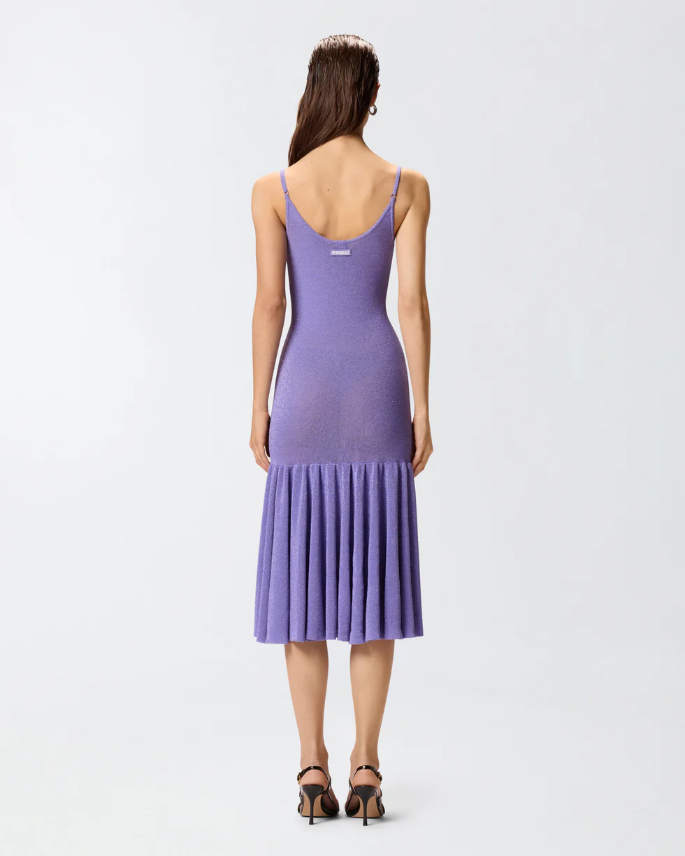Het mouwloze model heeft dunne, verstelbare schouderbandjes en een diepe ronde hals aan zowel de voor- als achterkant, wat zorgt voor een elegante en sensuele look. De dicht geplooide zoom geeft de jurk extra dynamiek en laat elke beweging sierlijk tot zijn recht komen. Op de achterzijde is het ontwerp afgewerkt met een label met jacquard PINKO-logo, als subtiel merksignatuur.