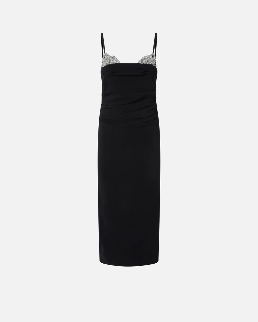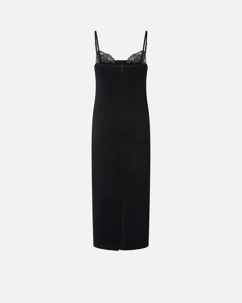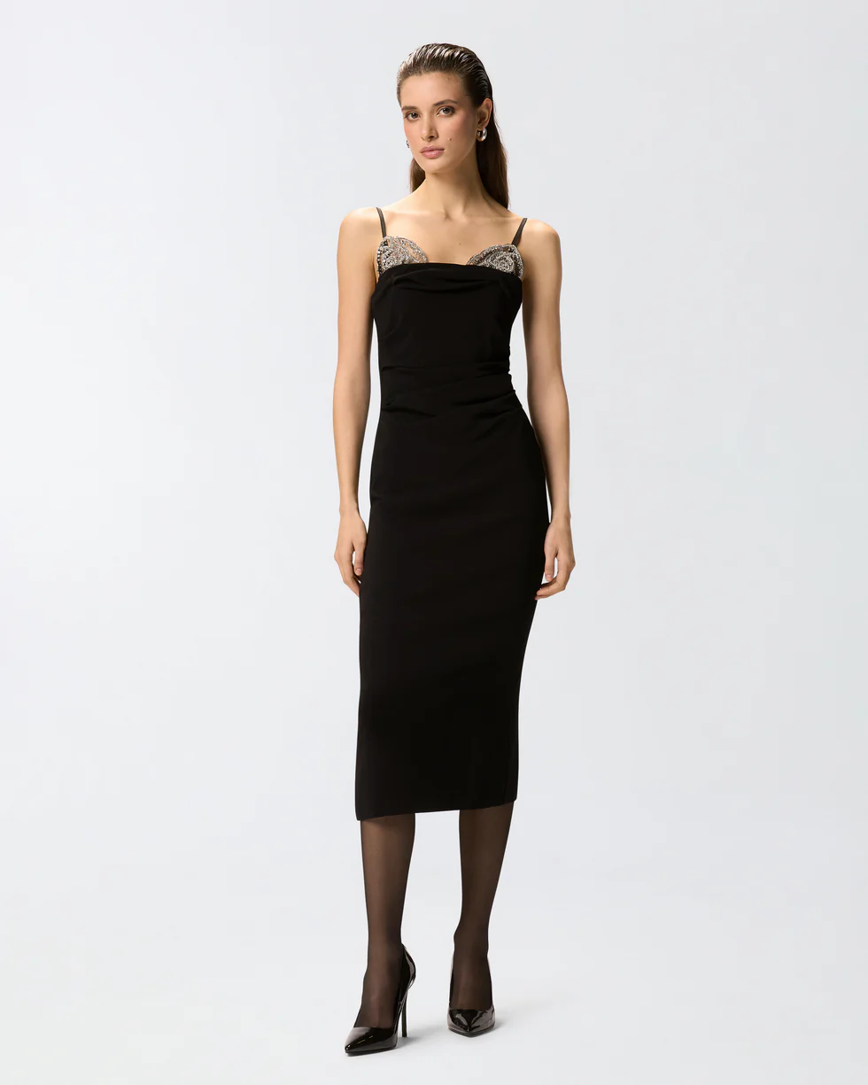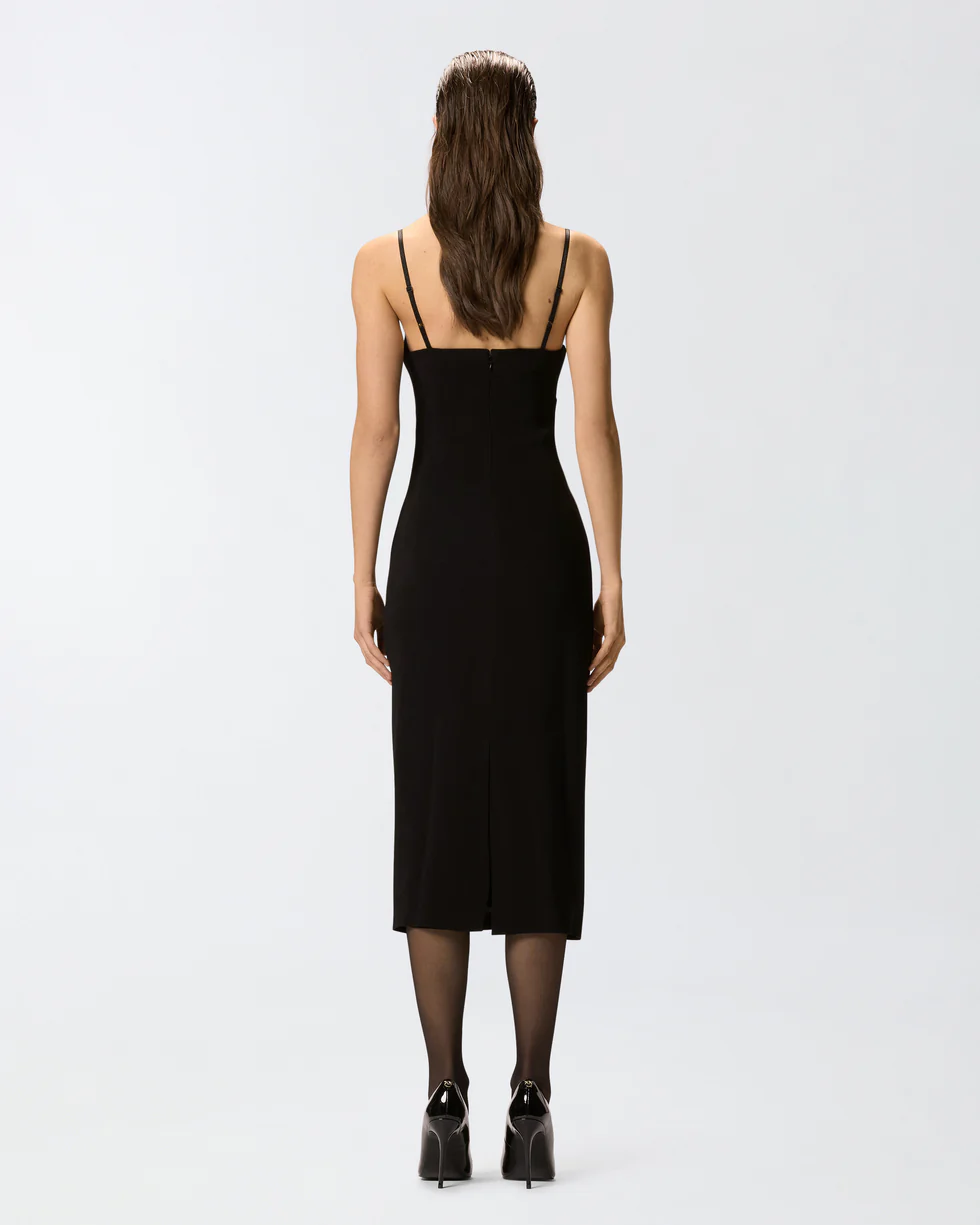 De mouwloze jurk is uitgevoerd met dunne, verstelbare schouderbandjes en vervaardigd van een double-weave stretch viscoseblend die het silhouet prachtig omsluit. De stof creƫert een subtiele, verfijnde draperie aan de voorzijde en accentueert op elegante wijze de vrouwelijke vormen.