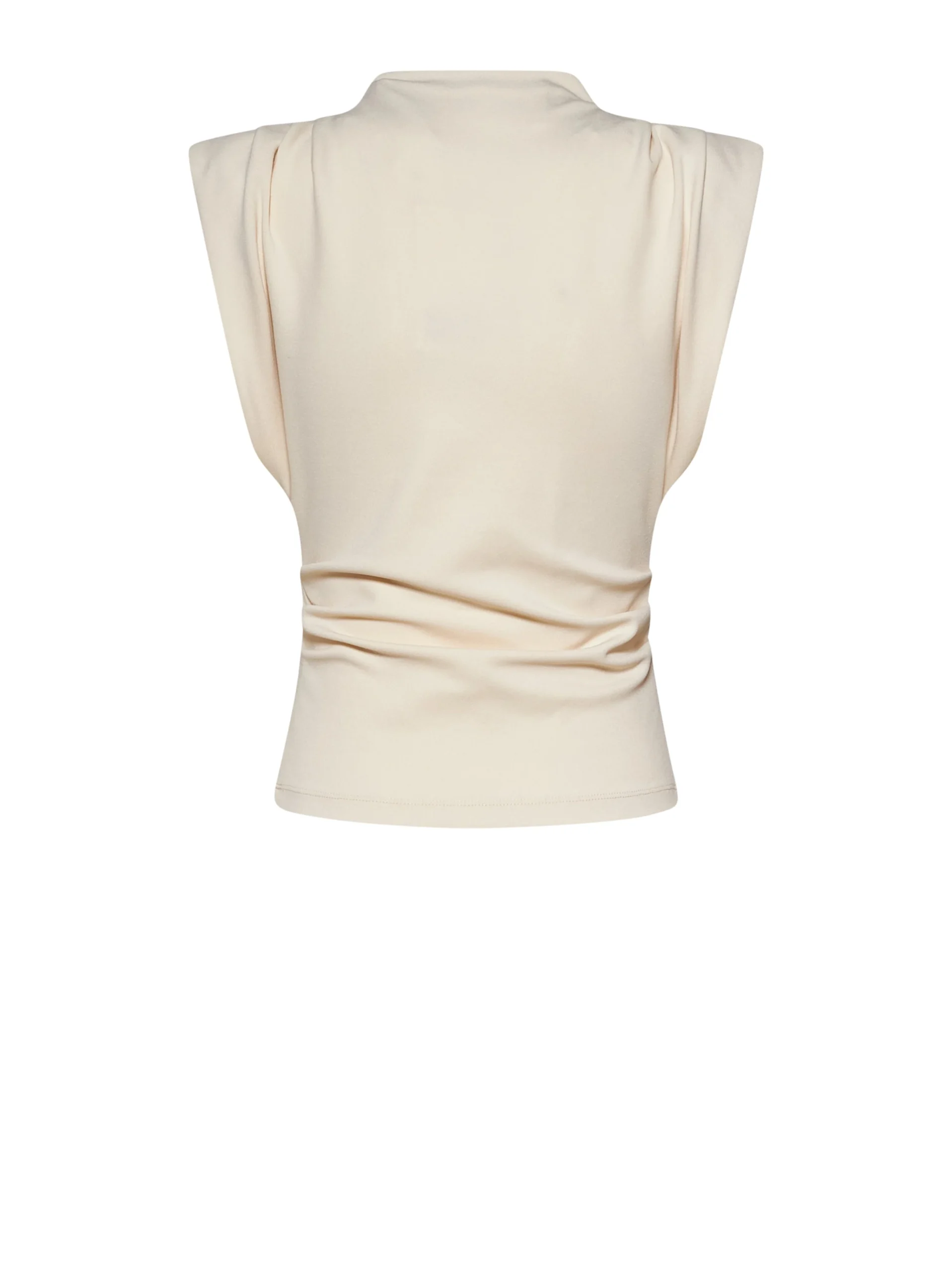 De gestructureerde pasvorm benadrukt het bovenlichaam op elegante wijze, terwijl de gedrapeerde details zorgen voor extra diepte en een speels effect in de stof. De combinatie van strakke lijnen en zachte vouwen maakt deze top veelzijdig en stijlvol.
