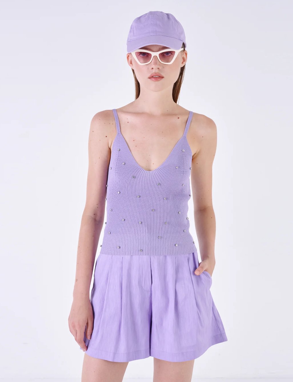 Met dunne bandjes en een diepe V-hals biedt deze top een flatterende pasvorm en een verleidelijke look. De decoratieve details met strass voegen een vleugje glamour toe, perfect voor zowel overdag als ’s avonds.