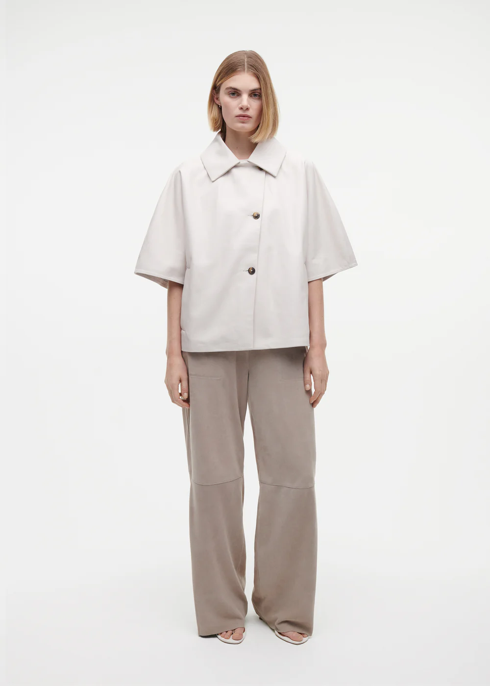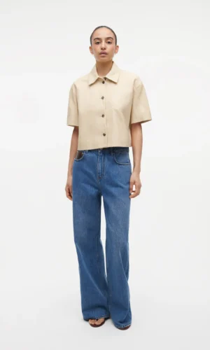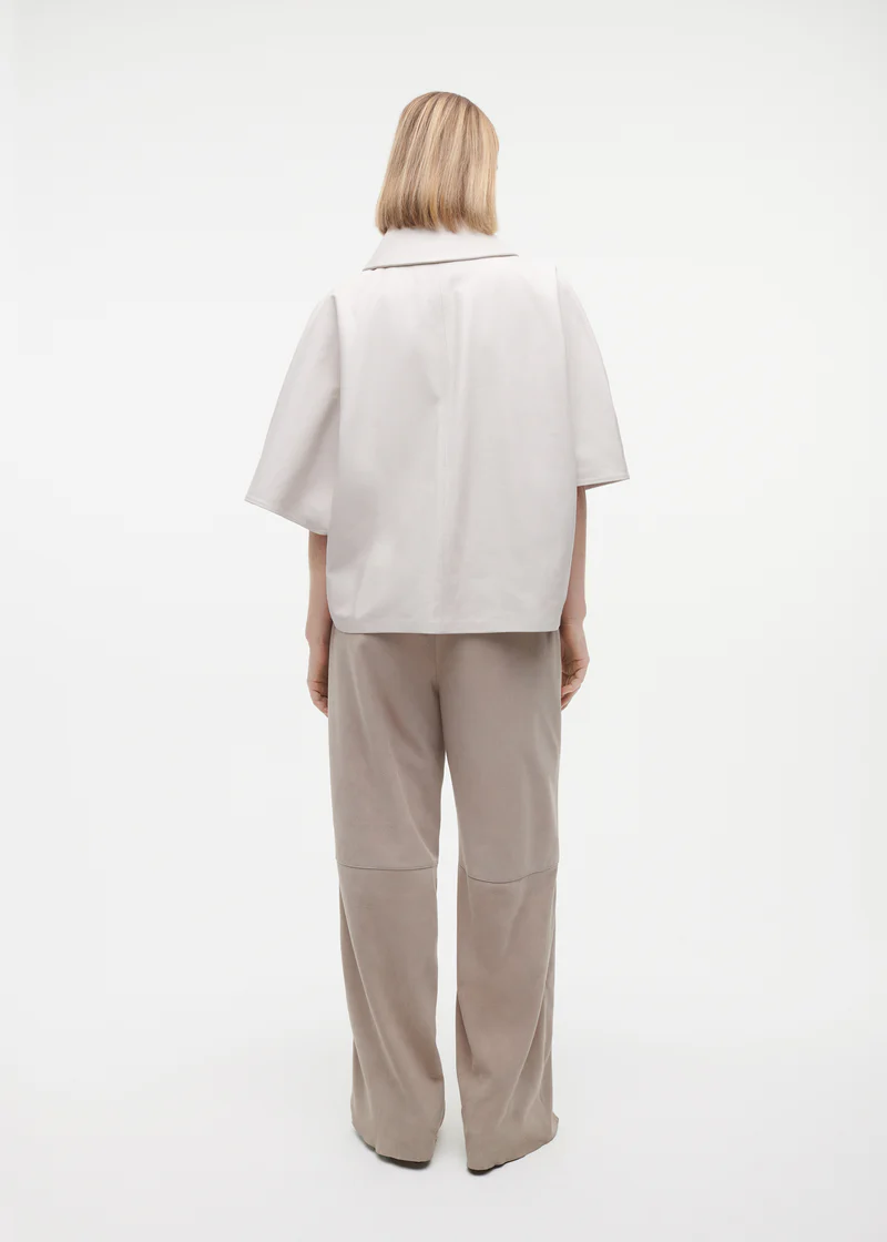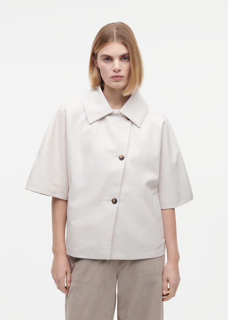 Dit leren jasje heeft korte mouwen en een licht oversized pasvorm, wat zorgt voor een moeiteloze, eigentijdse uitstraling. Het ontwerp combineert een relaxte silhouet met een gestructureerde vorm, waardoor het zowel stoer als elegant oogt. Perfect om te layeren over een blouse, top of jurk voor een moderne styling.